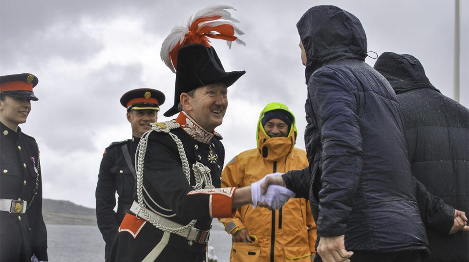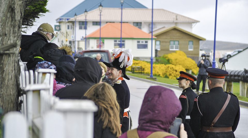 The day kicked off on Victory Green in Stanley, where the Royal Standard was raised and followed by a traditional 21-gun salute. Even though it was a rainy morning and the island winds were quite brisk, local residents came together to see the ceremony, showing their strong support. His Excellency the Governor, Colin Martin-Reynolds, led the event, with selected men and women from British Forces South Atlantic Islands and the Falkland Islands Defence Force, who carried out their duties with precision and pride.